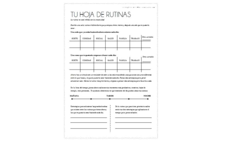 Para que empieces desde ya, a poner orden en el caos de tu vida creativa, te propongo el siguiente ejercicio que te ayudará a encontrar esas rutinas que quieres incorporar desde ahora mismo, en tu calendario.